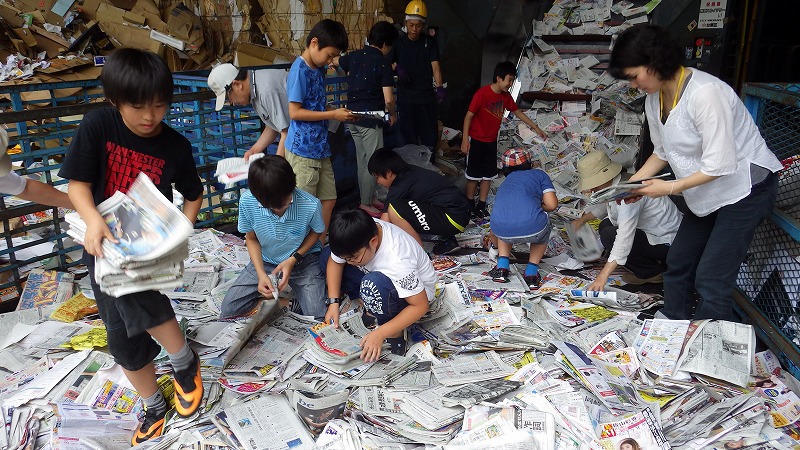 7月19日 台東区(こども環境委員会 第3回 「リサイくるくる探検隊」)主催による体験実習を受入れました。大人8名・中学生1名・小学生7名の参加でした。古紙の分別作業を体験してもらいました。