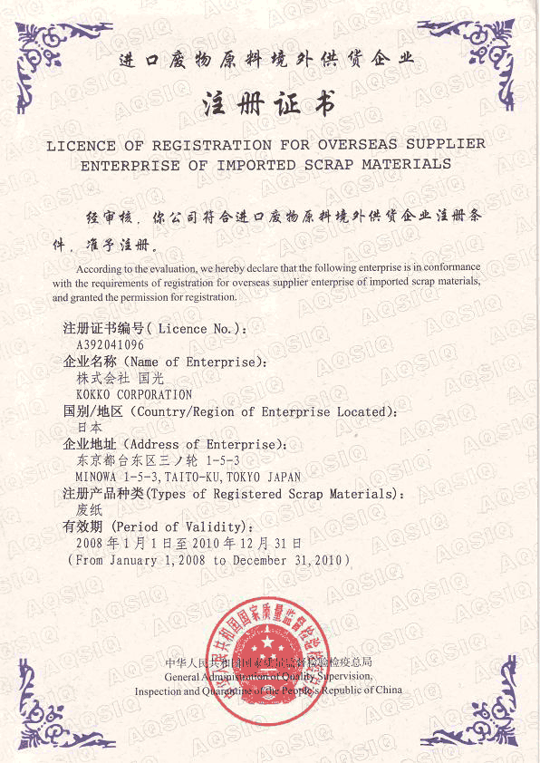 中国国家質量監督検査検疫総局より『古紙の輸出業者認定』更新