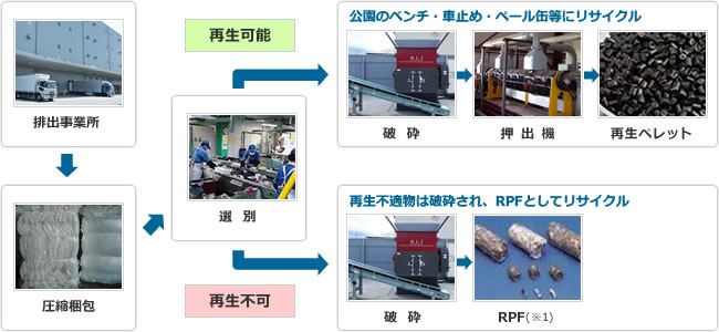 ストレッチフィルム・各種廃プラスチックは、選別・破砕・洗浄などの過程を経て、マテリアルリサイクル(再資源化)、または、RPF(ボイラー燃料)へとリサイクルされます。