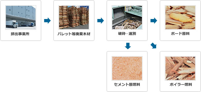 建設廃材・木製パレット等は、建材やバイオマス燃料としてリサイクルされます。